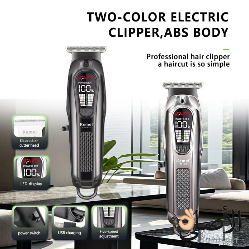 ماكينة حلاقة كيمي Kemei KM-1675 الاحترافية بمحرك قوي وشاشة LED و5 سرعات مختلفة تمنحك حلاقة دقيقة بدون شد، مناسبة للاستخدام المنزلي والصالونات.