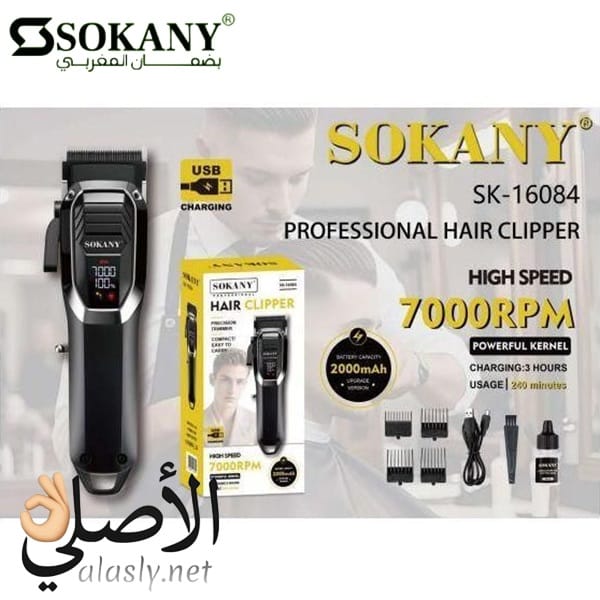 ماكينة حلاقة Sokany SK-16084 احترافية بسرعة عالية 7000RPM وبطارية 2000mAh، توفر أداء قوي ودقة عالية مع شاشة LED وتشغيل لاسلكي، مثالية للحلاقة المنزلية والاحترافية.