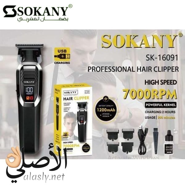 ماكينة حلاقة Sokany SK-16091 بسرعة 7000RPM وبطارية 1200mAh، توفر أداء سريع ودقة عالية مع شاشة ديجيتال وشحن USB، مناسبة للاستخدام اليومي المنزلي.