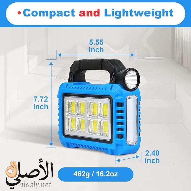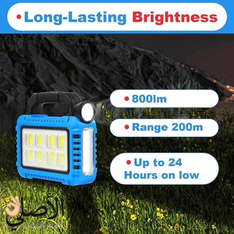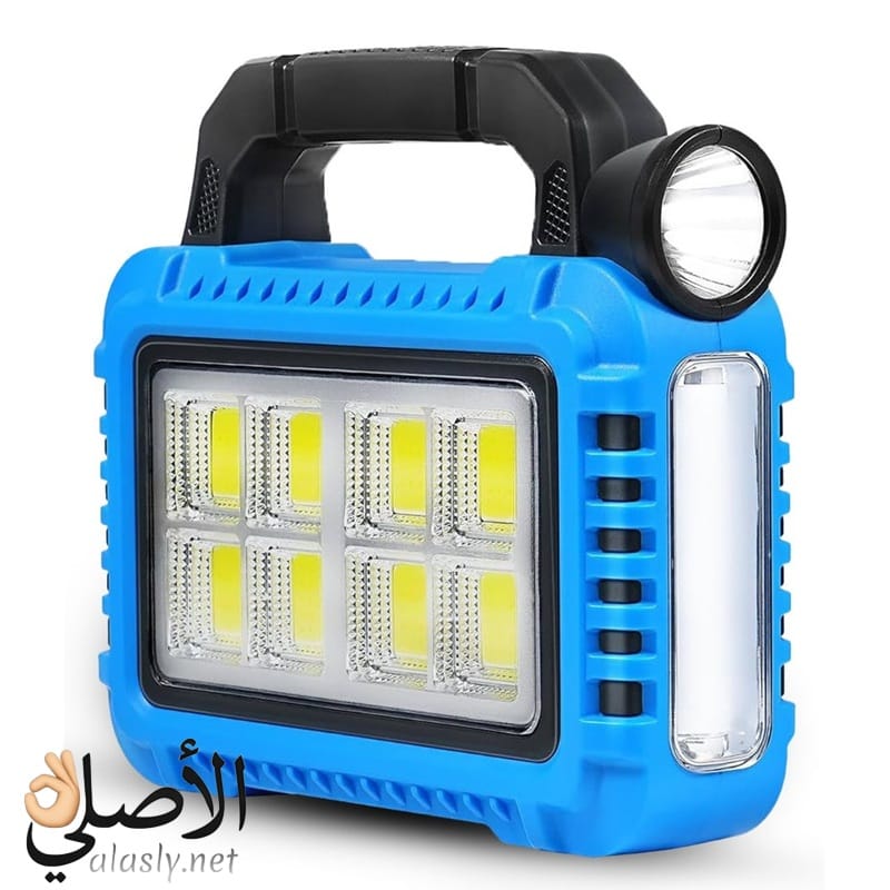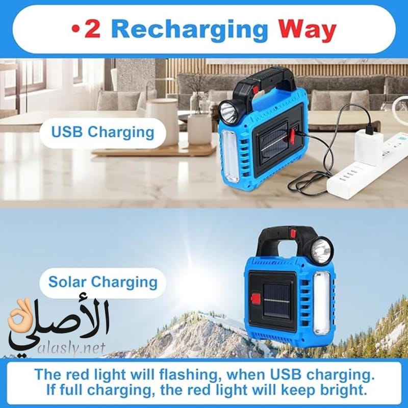 كما يعمل بالطاقة الشمسية أو الشحن بالكهرباء، ويحتوي على مخرج USB لشحن الموبايل عند الحاجة.