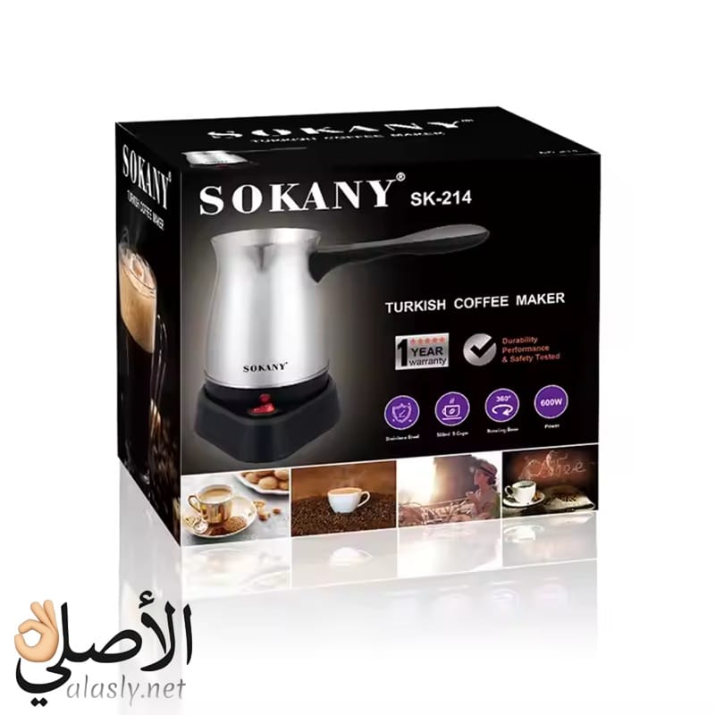 غلاية قهوة تركي سوكاني Sokany SK-214 هي ماكينة كهربائية عملية مصنوعة من الستانلس ستيل، توفر تسخين سريع وسعة 500 مل (حتى 5 فناجين)، مثالية لتحضير القهوة التركي بسهولة وأمان في المنزل أو العمل.